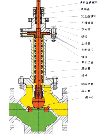 氣動波紋管密封調(diào)節(jié)閥就是在密封元件外面加了一層保護膜,防止帶腐蝕性的介質(zhì)直接接觸密封元件,而且在介質(zhì)壓力增大時,波紋管隨之伸長,降低介質(zhì)對密封面造成沖擊,在腐蝕性很強的介質(zhì)工況下,還可以采用雙波紋管結(jié)構(gòu)密封。