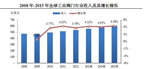 從中長期來看,影響閥門行業(yè)的下游行業(yè)擴張的主要因素,包括不斷增長的能源需求、全球人口的持續(xù)增加以及發(fā)展中國家的城市化、工業(yè)化進程并沒有因金融危機而發(fā)生根本性改變。目前全球各主要經(jīng)濟體都已經(jīng)進入經(jīng)濟復蘇周期(根據(jù)國際貨幣基金組織的統(tǒng)計和預測數(shù)據(jù),2010年、2011年和2012年全球經(jīng)濟增長實現(xiàn)恢復性增長,增長率分別為5.3%、3.9%和3.2%,2013年和2014年全球經(jīng)濟年增長速度預計為2.9%和3.6%)。閥門行業(yè)自2010年也開始走向復蘇,根據(jù)McIlvaine的調(diào)查和預測數(shù)據(jù),2010年、2011年和2012年,全球工業(yè)閥門行業(yè)收入分別為492.24億美元、513.17億美元和532.61億美元,增長率恢復至3.77%、4.25%和3.79%,2013年-2015年全球工業(yè)閥門行業(yè)的預計銷售增長率將分別達到4.22%、4.05%和4.36%,呈現(xiàn)穩(wěn)步上升的增長態(tài)勢。