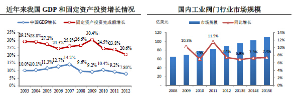 2003年-2012年,中國經(jīng)濟總體上保持快速增長的發(fā)展態(tài)勢,平均GDP增長率為10.45%,全社會固定資產(chǎn)投資完成額增長率平均為26.11%。國內(nèi)閥門行業(yè)整體上保持持續(xù)增長的態(tài)勢,景氣程度高于全球水平。2008年全球金融危機爆發(fā)后,國內(nèi)閥門行業(yè)增速下滑,但在2010年又恢復到較高的增長水平。根據(jù)McIlvaine的分析,預計2013年至2015年,中國工業(yè)閥門行業(yè)市場規(guī)模的增長率還將穩(wěn)定在7%左右,遠高于全球的工業(yè)閥門行業(yè)增長速度。