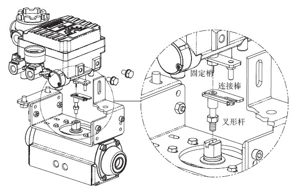 4,設(shè)定好叉形桿后,順時(shí)針?lè)较驍Q緊叉形桿下面的固定螺絲。把閥門定位器安裝在支架上。閥門定位器放置在支架上方時(shí),主軸下面的固定梢對(duì)準(zhǔn)叉形桿上方的中心孔內(nèi),同時(shí)把主軸反饋桿上的連接棒插入到叉形桿的插槽。這是為了讓閥門定位器的主軸和氣缸軸的中心一致,如果中心沒(méi)有對(duì)準(zhǔn),那么閥門定位器的主軸上產(chǎn)生負(fù)荷力,影響產(chǎn)品的內(nèi)構(gòu)成,因此請(qǐng)正確對(duì)準(zhǔn)中心。